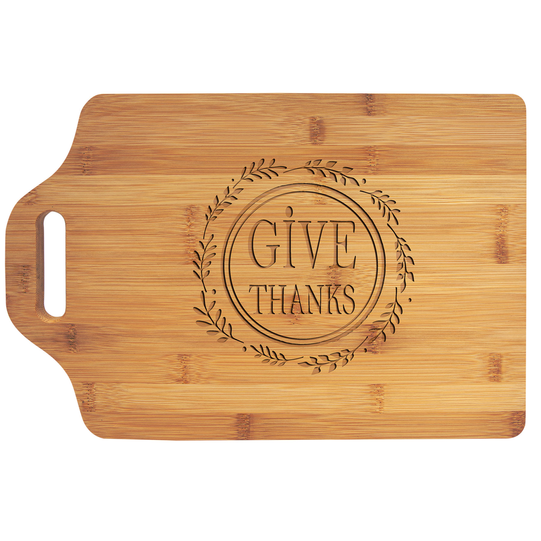 New Style bamboo handle cutting boards These bamboo cutting boards have a handle. Can be engraved sideways like above or handle on top. Come in 4 sizes, 9 x 6, 11 x 7 3/4, 13 x 9, 15 x 10 1/4". |