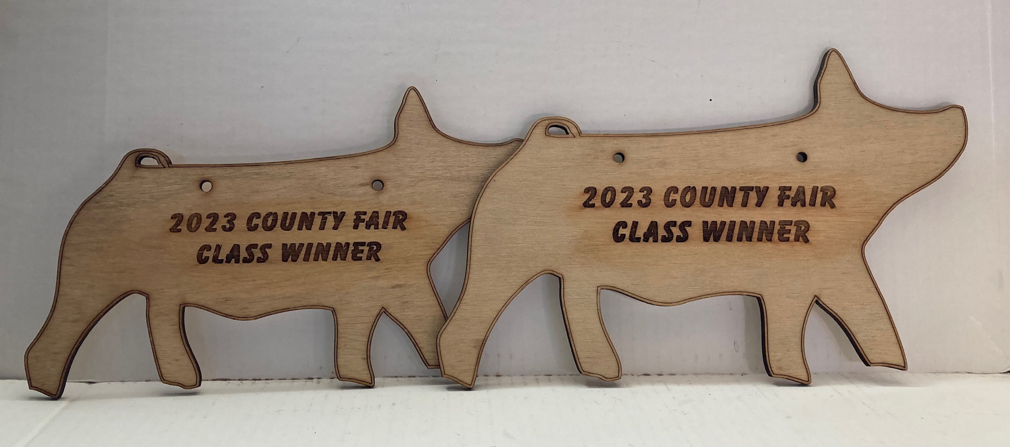 Wooden fence animal magnets NEW - these little wooden items are totally unique! We designed them for a magnet on the back or you can hang it. We can put any of out animals in the gate. If you don't want the word "exhibitor" on top, no problem we can take it off or put the name of your fair, champion or anything else that fits. These are several layers of wood. The little sign swings back and forth when moved! Great little gift for each exhibitor or for your ranch! These can also have the plate on the bottom for more wording. Made in the USA. |